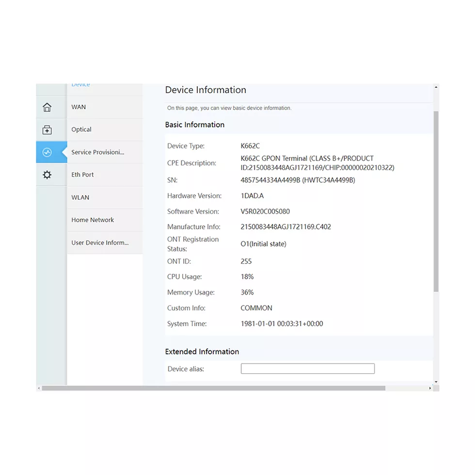 Bu, 3 iş rejimi olan üçü birdə bir cihazdır. Biri optik modem rejimi, digəri simsiz marşrutlaşdırıcı rejimi, digəri isə fiber-optik şəbəkə rejimidir (parametrlər mürəkkəbdir və qabığı tamamlamaq və proqram təminatı proqramını yeniləmək lazımdır. Adi üçün tövsiyə edilmir. istifadəçilər bunu sınamaq üçün). Rejim parametr elementində dəyişdirilə bilər. K662C aparat konfiqurasiyası: CPU Hisilicon SD5117P (iki nüvəli 1.6), fləş yaddaş 128M, yaddaş 256M-dir. Wireless AX 80MHz, 160MHz 2 kanaldır, MESH şəbəkəsini dəstəkləyir, WIFI6-nı dəstəkləyir və simsiz sürət 3000M-dir.